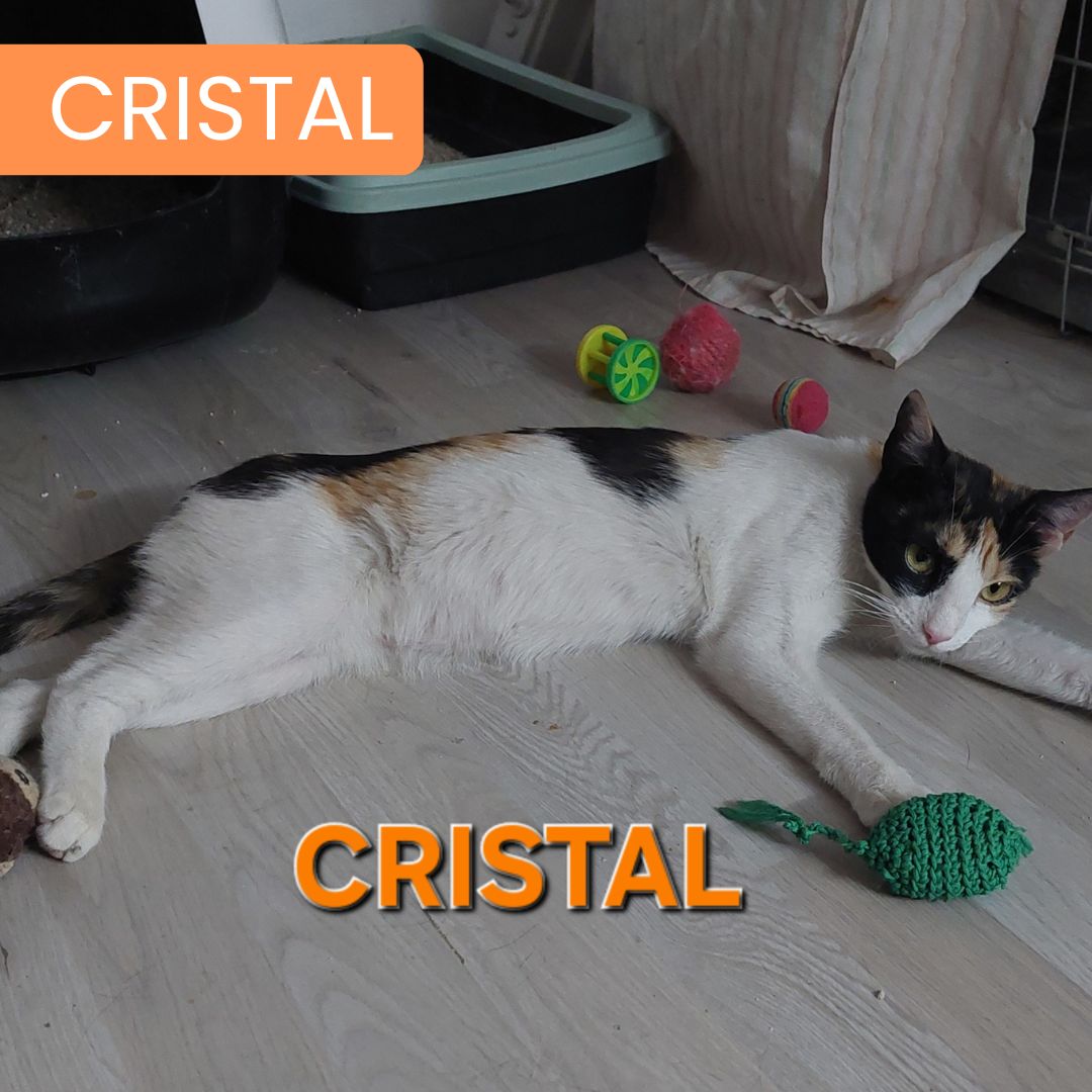 Hola, me llamó Cristal. Soy una gatita joven, super cariñosa con los humanos y prefiero ser gatita única. Llevaba ya unas semanas en la calle y no lo pasé muy bien, los otros gatetes me pegaban y me costaba poder llegar a la comida. Estaba buscando comida y acabé en la puerta de un local maullando. Allí estaban una chicas muy majas que se pusieron a hablar de qué hacer conmigo y, sin darme apenas cuenta, estaba metida en un espacio pequeño donde me pusieron agua, comida, arenero y camita. Poco a poco fui confiando y ahora estoy en una casa de acogida esperando el hogar definitivo.